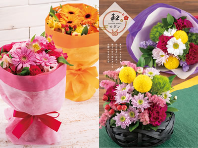 ![]() 色鮮やかな生花や花鉢、簡単に飾れる置き型ブーケや和モダンなテイストのお花などもお選びいただけます。 |