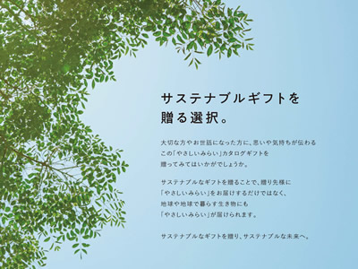 ![]() サステナブルなギフトを贈ることで、贈り先様に「やさしいみらい」をお届けするだけでなく、地球や地球で暮らす生き物にも「やさしいみらい」が届けられます。 |